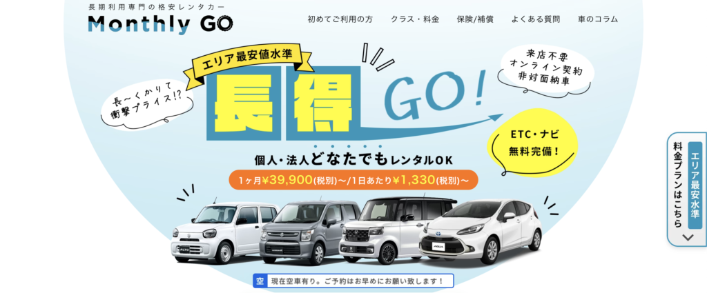 Monthly Goは、個人・法人問わずどなたでもOKな、長期レンタルに特化したレンタカーです。