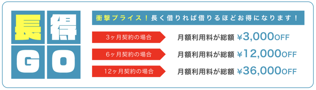 さらに期間が長くなるほどに安くなる割引も用意しております。